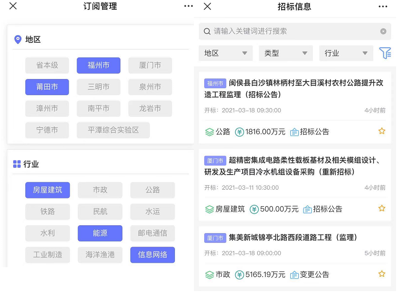 专业的招标信息订阅和搜索平台,免费搜索招标信息不遮挡,随时关注项目进程,围绕“标前,标中,标后”的交易全过程,及时推送订阅信息。一个全面、及时、精准、快捷的订阅系统。